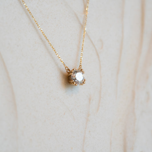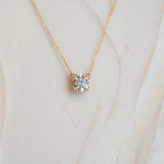 The Nessa Solitaire Necklace is a delicate and timeless design that balances classic sophistication with an unusual, artistic edge. This piece features a 1ct round brilliant lab grown diamond, held within an intricate triple split claw collet. This unique setting adds a layer of structural intrigue to the design while intentionally minimising obstruction, allowing maximum light to flood the diamond from every angle. Because of this thoughtful open work structure, the Nessa Necklace offers a brilliance that feels both airy and intense.