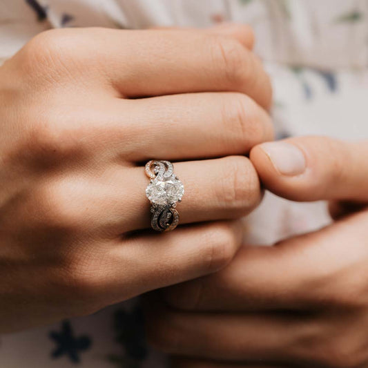 The Prina Ring is designed to captivate with its bold elegance and radiant sparkle. At its centre, a stunning oval lab grown diamond draws the eye with exceptional brilliance, creating a luxurious focal point. The shoulders are adorned with meticulously set lab diamonds, adding a cascade of shimmer that beautifully enhances the elongated silhouette of the centre stone. Because of its refined proportions and shoulder set detailing, The Prina Ring offers maximum light play from every angle. The diamonds flow seamlessly along the intricate detailing of the band, giving the ring a luminous, high impact presence. A striking statement choice for an occasion cocktail ring or a modern engagement ring.