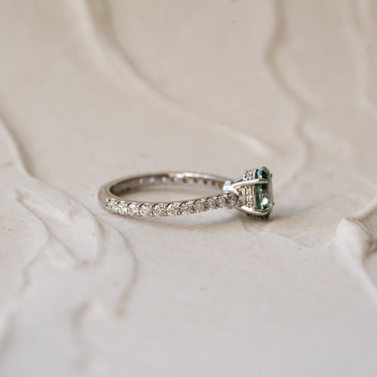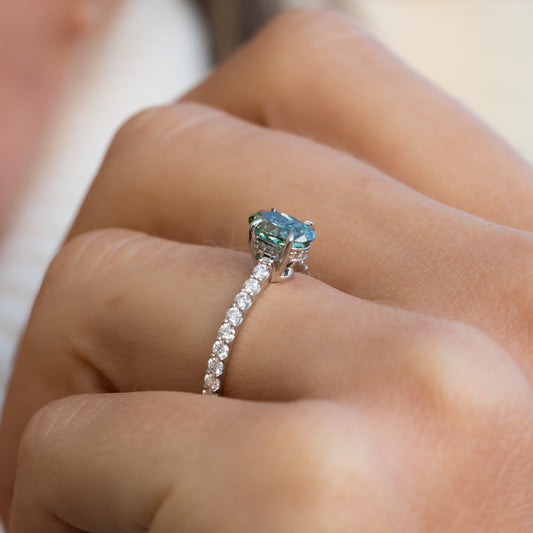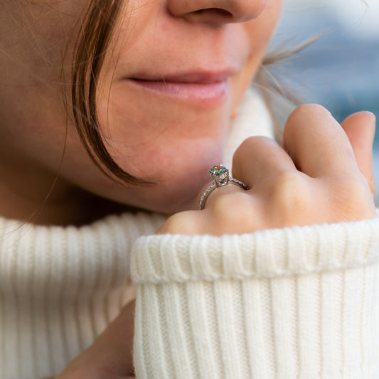 The Elsie Ring is a beautifully refined design that blends modern elegance with a touch of hidden radiance. At its centre sits a captivating 1.06ct fancy vivid green oval lab grown diamond (7.7 × 5.25mm), chosen for its unique hue and slim elongated silhouette. Gently embracing the centre stone are 0.60ct of shimmering claw set side diamonds, arranged to enhance brilliance while maintaining a graceful, balanced silhouette.