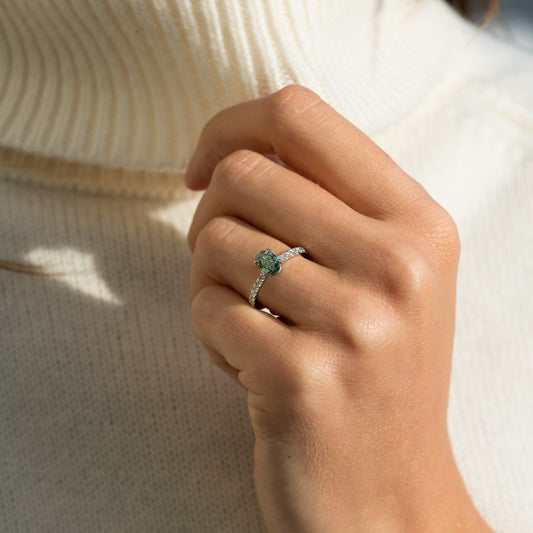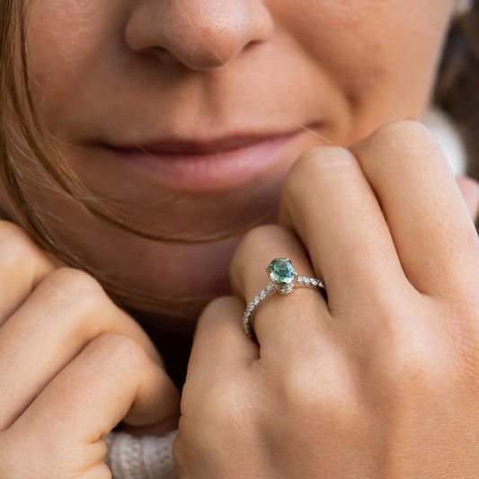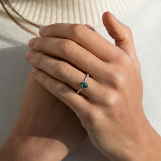 Adding to its enchanting appeal, a subtle hidden halo sits just beneath the oval centre diamond, offering a secret burst of sparkle that reveals itself with movement. Because of its slender, beautifully proportioned shank, this engagement ring flatters the hand and provides effortless comfort, while the refined detailing ensures all focus remains on the vibrant green centre gem.