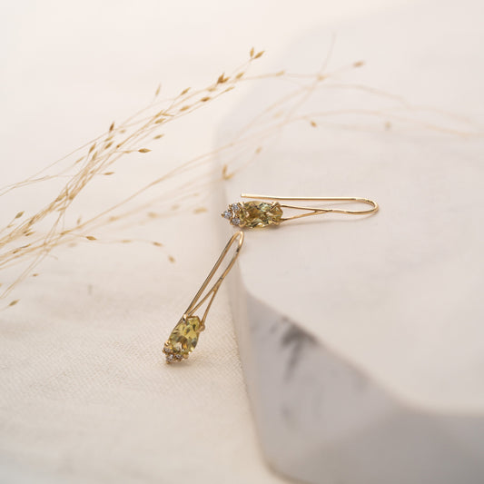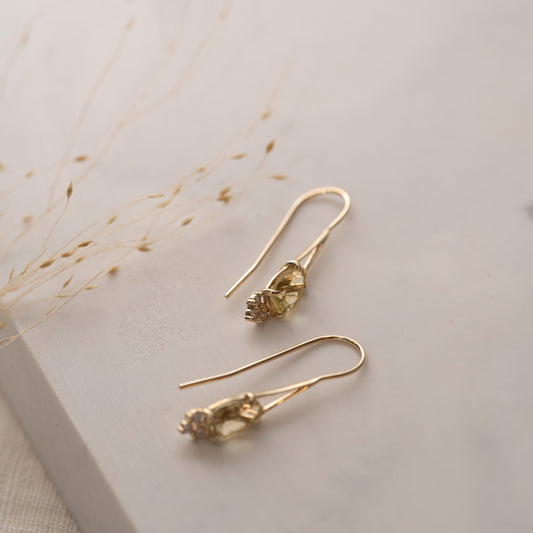 A sophisticated and unique pair of yellow gold pear drop earrings boasting an ethically sourced pear cut lemon quartz centrepiece. Three small round cut diamonds support and accentuate the warmth and beauty of the stone above which is also celebrated by the talon-like grip of its claw setting. The strength of this grip paired with the teardrop shape made up of the gold fitting around the stones make these earrings an expression of resilience and femininity that are sure to draw everybody’s attention.