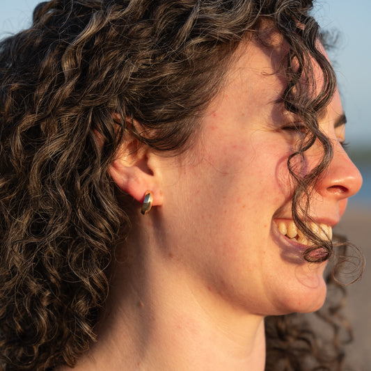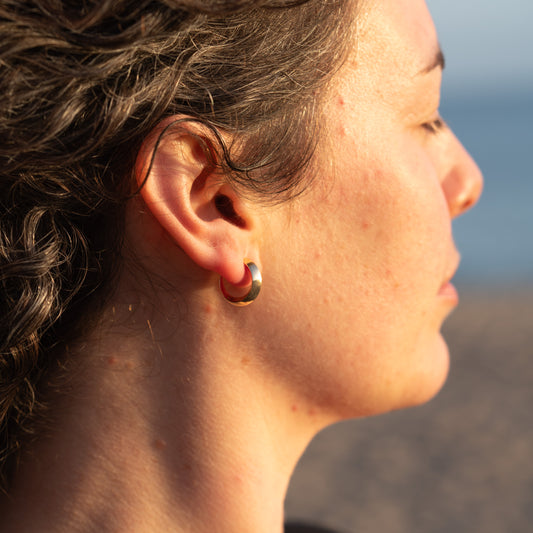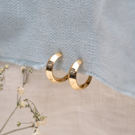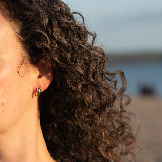 A simple and elegant pair of hoop earrings crafted from fully recycled yellow gold. The voluptuous curve of the Glanna Earrings is offset by a knife-edge peak that runs down the full curve of their shape which hints at a subtle but unmistakable expression of strength and femininity. A classic and timeless design, these huggies will add class and style to any wearer.