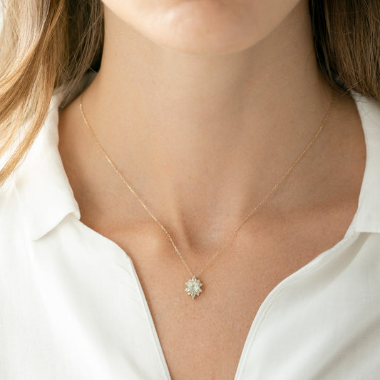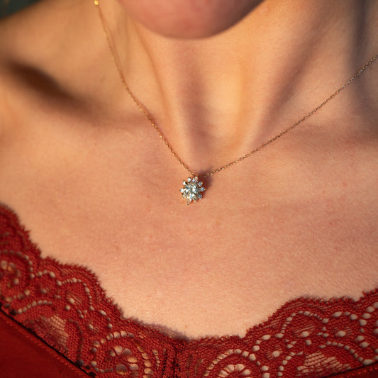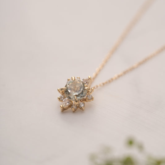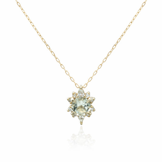 A stunning lotus flower choker pendant necklace with an ethically sourced pear cut green amethyst at its centre. Round cut lab grown diamond petals encircle the claw set gem with a sunburst halo on an elegant yellow gold chain. Lotus flowers bloom beautifully each morning from murky waters so the Karensa Pendant represents purity and resilience and is sure to imbue its wearer with inner strength and beauty. A feminine charm halo flower pendant which balances delicate tones of green and yellow gold to create a glittering and irresistible piece of jewellery. A sparkling piece sure to charm all who glimpse it.