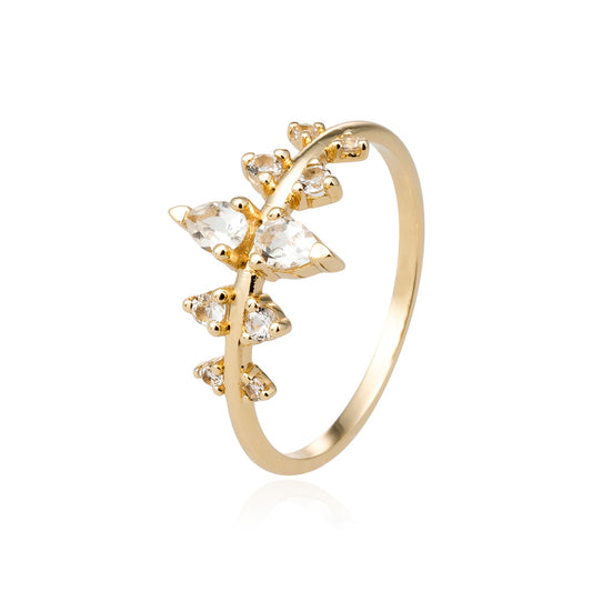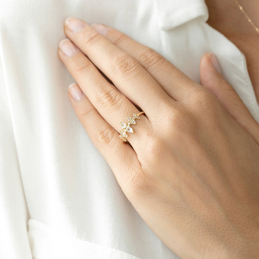A distinctive yellow gold ring with a prickling of sustainably grown pear cut sapphires and lab grown diamonds, reminiscent of a holly leaf. The sharp aesthetic of the Kelynen Ring, perfect for stacking or wearing alone, represents a strength and resilience that accompanies the sparkling femininity in this striking and unusual piece. The nature inspired design of this ring celebrates pointy edges with the tiered shape of lab grown diamonds which create a larger triangular form to exaggerate their sharp claw settings and honour the power and femininity of the wearer. A unique and captivating ring sure to catch the eye of all who see it.