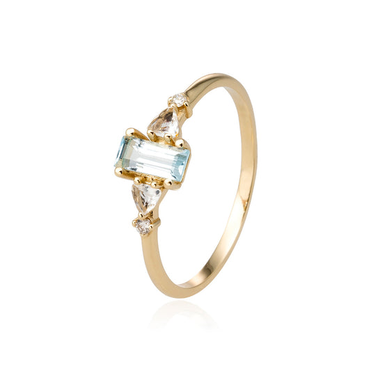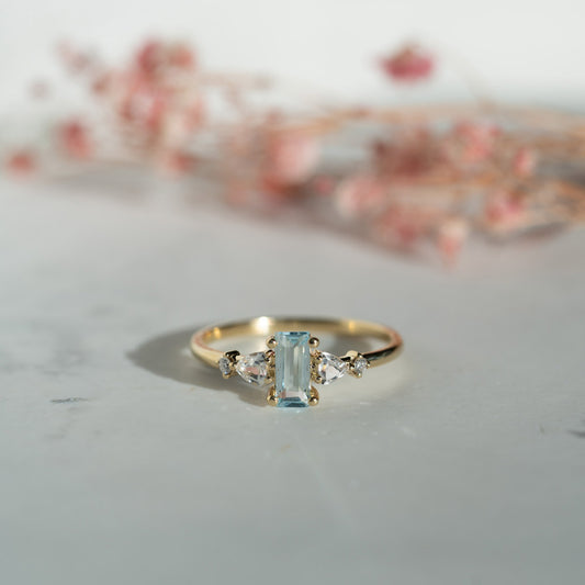 A sophisticated yellow gold accented ring with an ethically sourced emerald cut topaz gemstone as its centrepiece. Part of the Senara Collection, this pretty ring is sided by sustainably grown trillion and round brilliant lab diamonds. The Morvoren Ring features a triangular design to express balance and unity between mind, body, and soul. The combination of warm yellow gold and cool pale blue topaz has a vintage feel to it, but also brings to mind the regality of the sea and invokes the powerful and feminine spirit of the sea maiden, imbuing the wearer with her same qualities. This is a dazzling accented ring charged with beauty, strength, and resilience that will surely catch everyone’s eye.