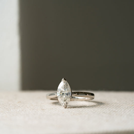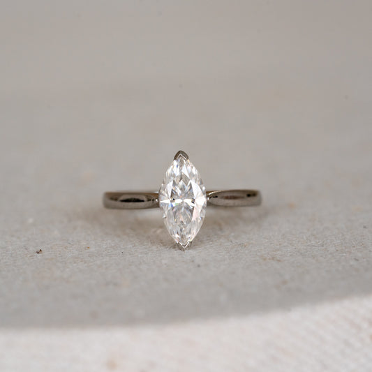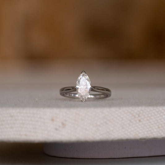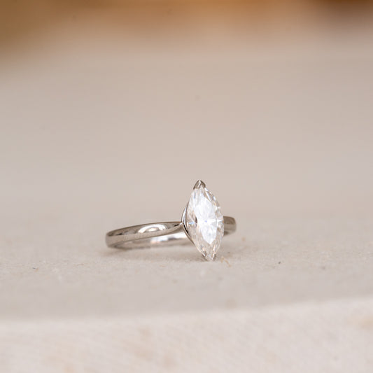 The classic style of the Rosemont Ring perfectly combines simplicity with individuality. The tapering court band arches elegantly towards the striking marquise cut centre gem, simply set within two "V" claws.
