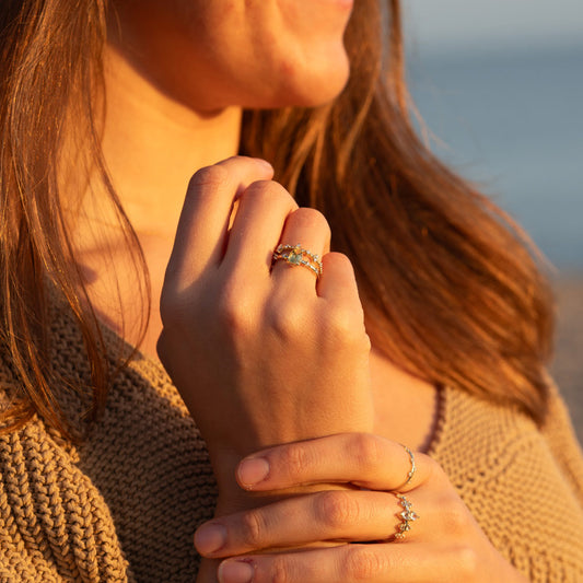 The Senara Collection pieces are set with VS1 D-E lab grown diamonds, ethically sourced natural gemstones and 100% recycled 9k gold.