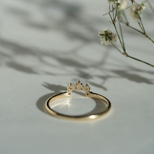 A striking square crescent yellow gold stacking ring that pairs perfectly with a ring that has a princess or emerald cut centrepiece. This Steren Ring boasts a square-shaped crescent of sustainably grown lab diamonds, giving the ring an air of sparkling power and refinement. The wearer of this ring will find it elevates the jewellery it is paired with from something with gentle vintage femininity into a crowned tiara jewel of power and radiance. A stylish and twinkling piece.