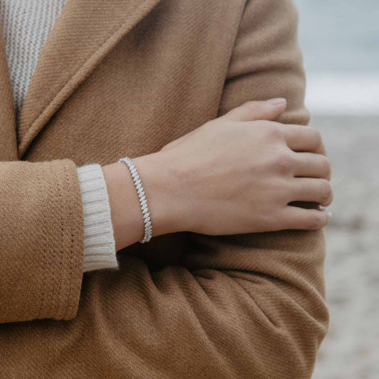 This bracelet is set with an expertly cut Ethica Diamond®,  the finest grade D-E VVS1, moissanite and is set in Rhodium Plated 925 Sterling Silver.