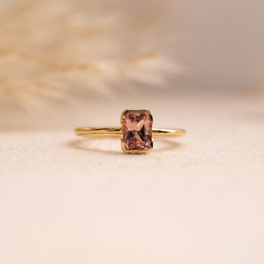 The contemporary and elegant Danae Ring features a minimalist rubover setting, allowing the stunning antique cut, peachy pink cushion sapphire to take centre stage. Expertly cut and flawlessly faceted to emphasise its clarity, the Chatham® sapphire is embraced by a split rubover setting that allows maximum light to enter the stone.