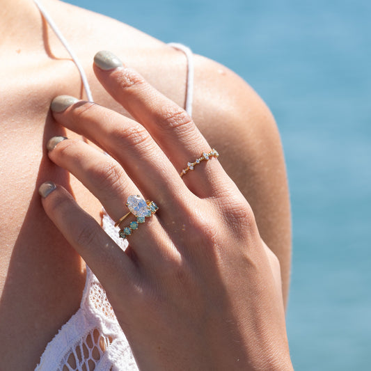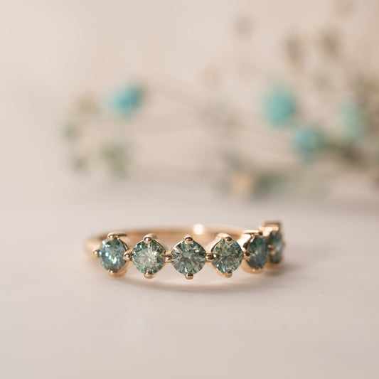 The Jamila Ring features round expertly cut, independently graded Ethica Diamond® moissanite is a truly unique and luxurious stone giving off seafoam and gentle green hues, a ring for ocean lovers.