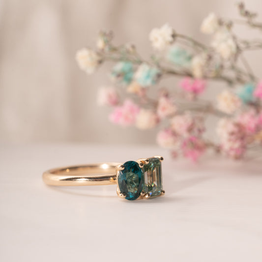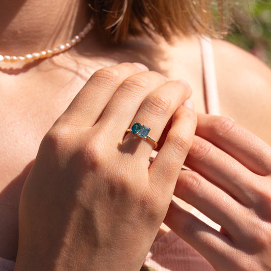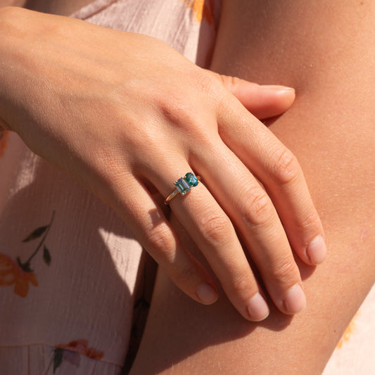 Crafted with care and love, the dainty Mira Ring is set with aChatham® lab-grown deep teal oval cut Pariba which have lovely colour and excellent clarity, capturing the vivid hues of ocean waters, and complemented beautifully by the seafoam emerald cut, independently graded Ethica Diamond® moissanite, representing the sparkle of sunlight dancing on the sea's surface.