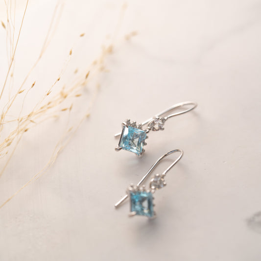 A dazzling pair of white gold fish hook drop earrings that are sure to stand out for the radiant blue colour of their ethically sourced princess cut white topaz gemstone. The centrepiece is crowned by a sustainably grown round cut lab diamonds that is supported by a row of smaller claw set lab diamonds giving the appearance of a regal jewel wearing its tiara. The Veryan Earrings will cause their wearer to radiate a cool majesty with their dainty but powerful mix of squared and rounded shapes. An essential accessory for anyone who wants to make a statement of their strength and femininity.