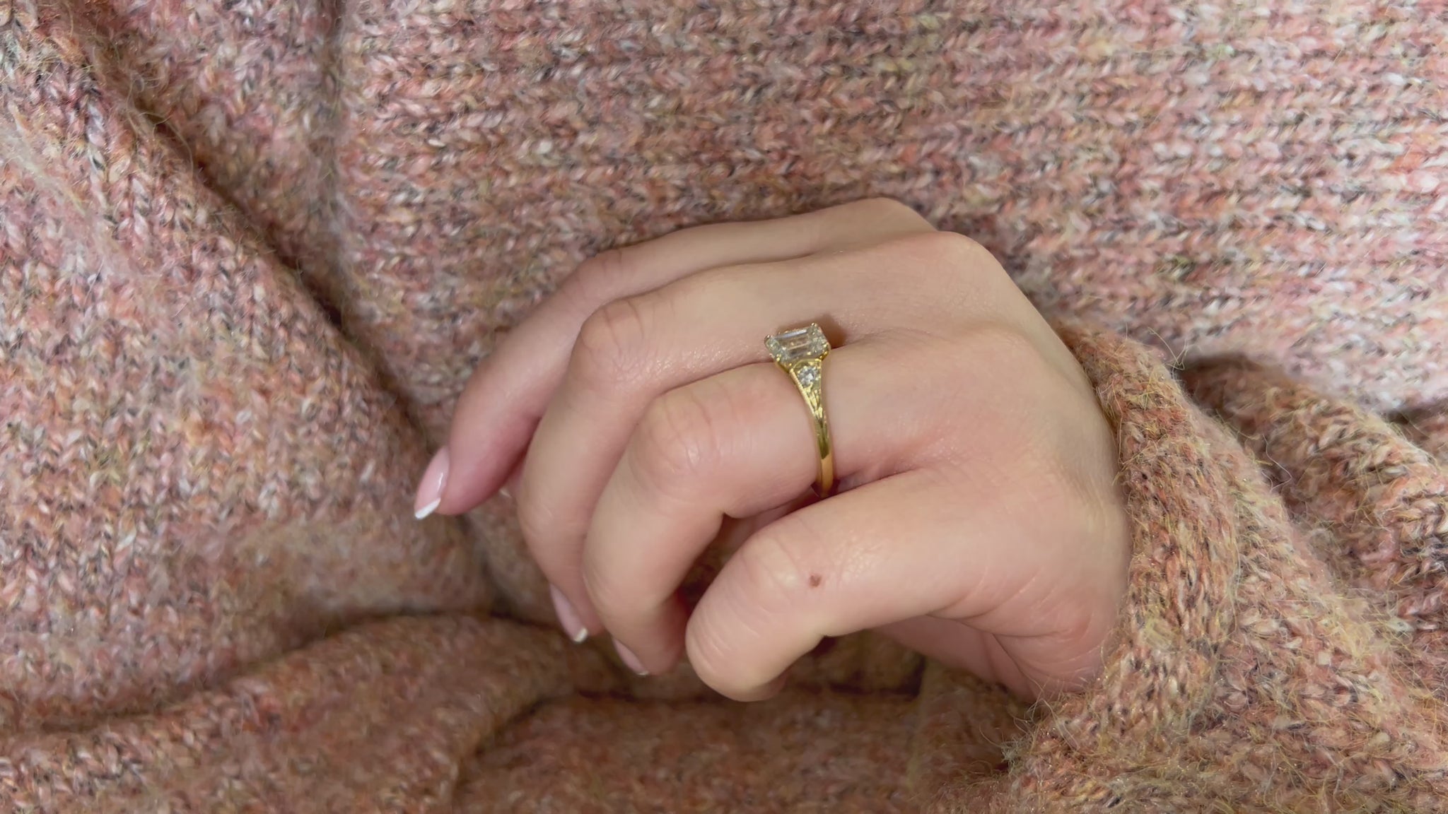 Classic simplicity, with an art deco vintage twist defines this delicate accented engagement ring design, which features a central emerald cut lab diamond, on a comfortable thin European shank band that gently tapers towards round brilliant accents, set with intricate milgrain on each side.