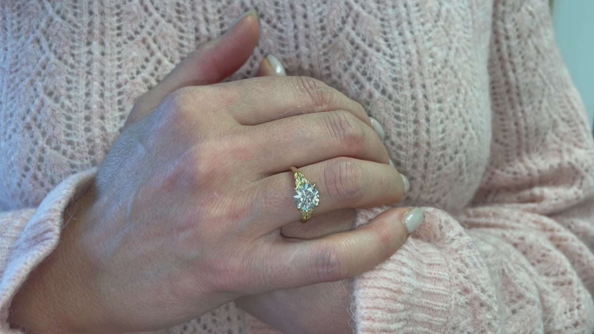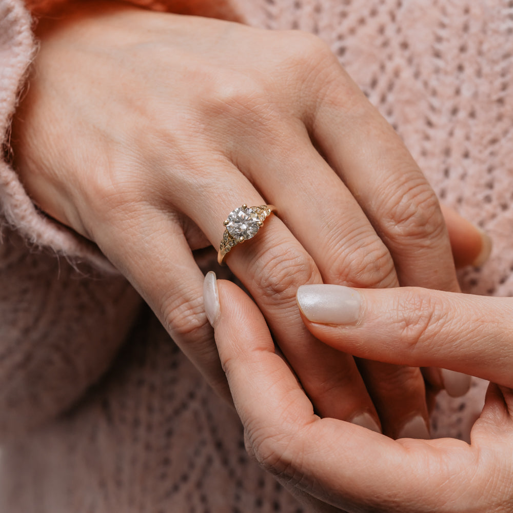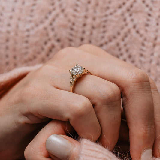 The Sabine Ring is a truly beautiful vintage inspired design. A round brilliant cut centre stone blooms from a collection of intricately created, barleycorn inspired lab diamond set shoulders. Dainty lab grown diamonds are secured in place by grain setting, giving this ring its perfectly classic look.