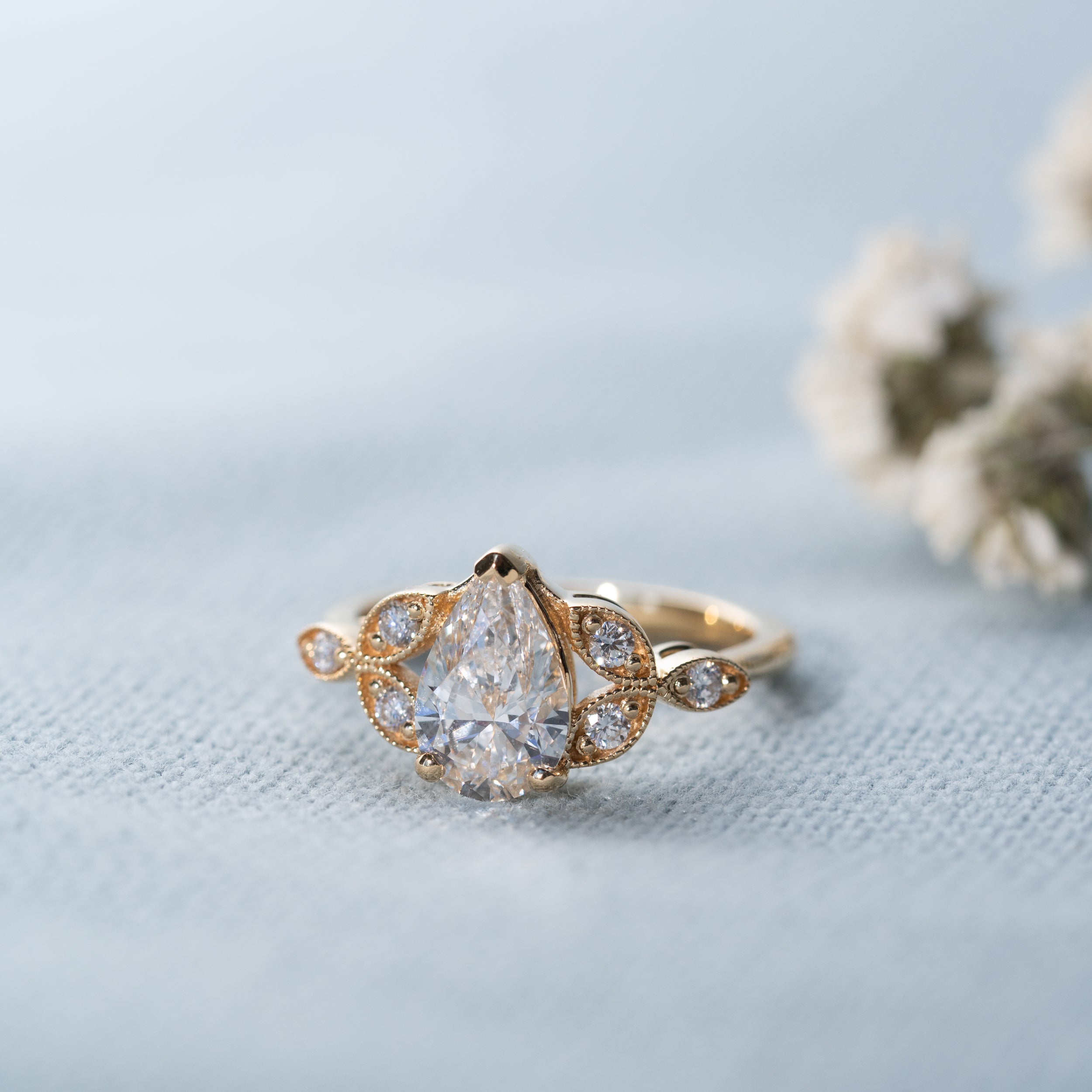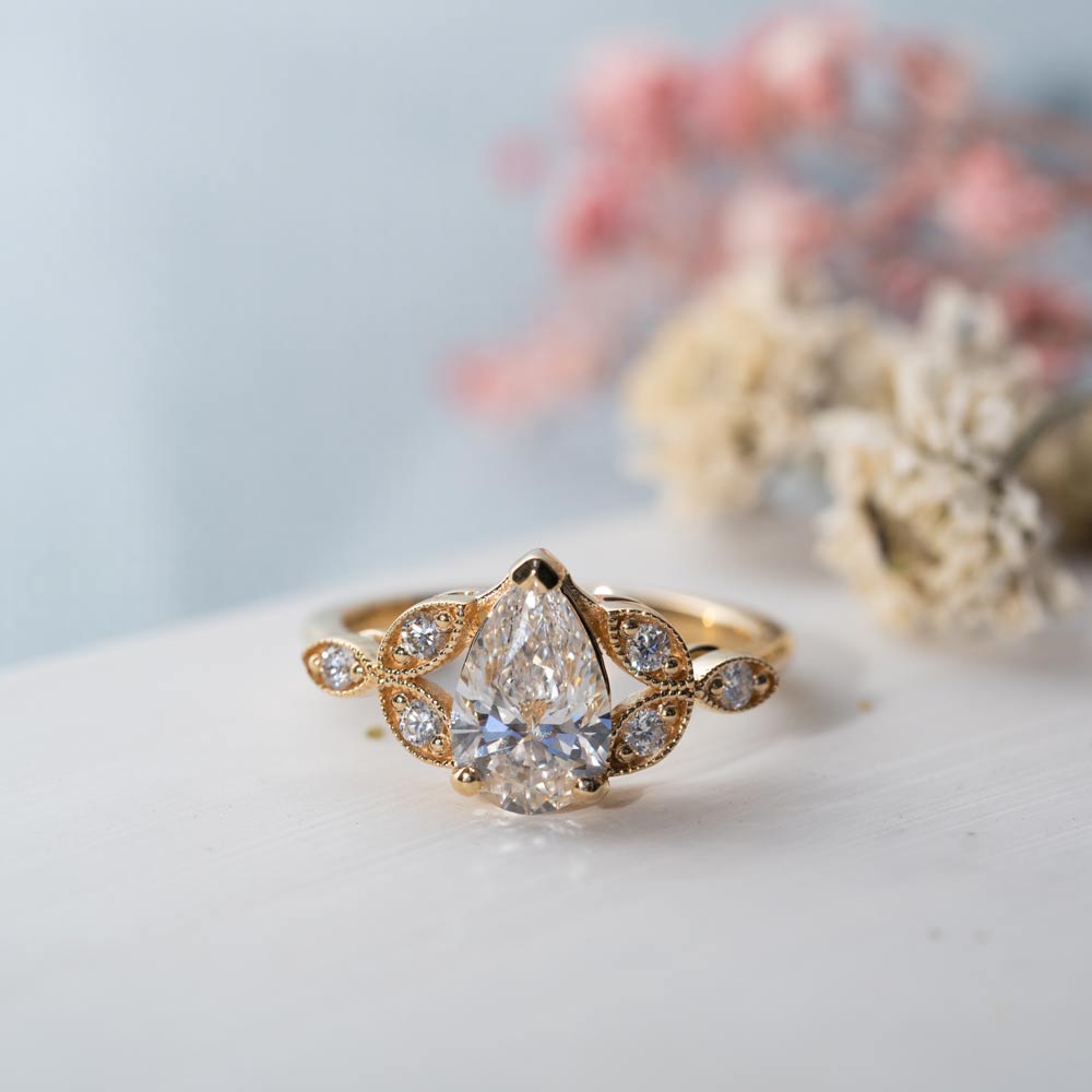 The nature inspired Theresa engagement ring features a floral and feminine design; with four triple claws encasing the oval cut lab diamond, with milgrain leaf detail surrounding the shoulder set accented diamonds.