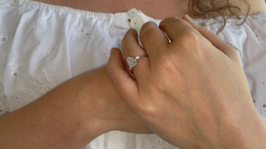 An Art Deco dream, the Cami trilogy ring features two dazzling tapered baguette cut lab grown diamonds resting alongside the perfect pear cut lab grown diamond centre stone for a glamorous, sophisticated engagement ring design.