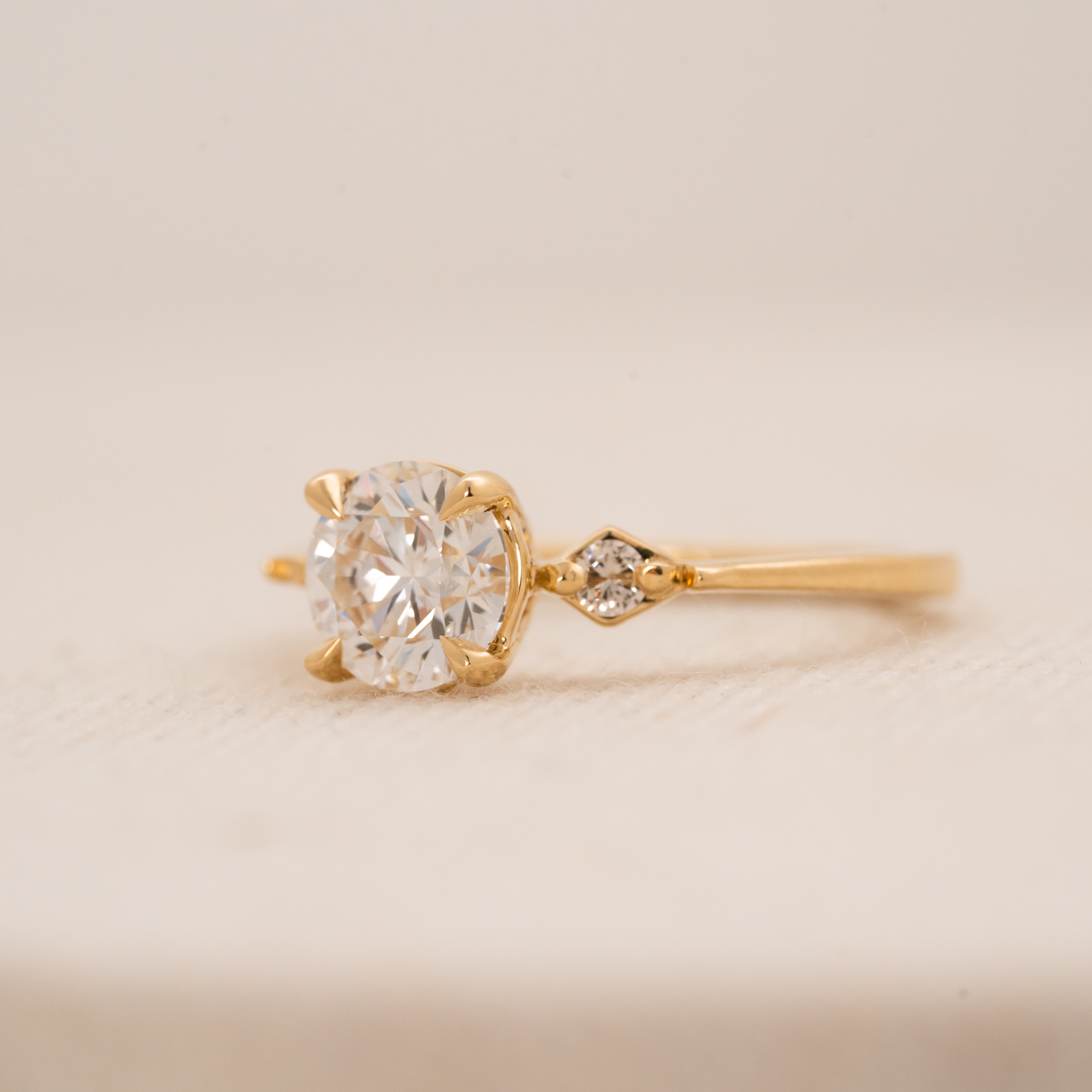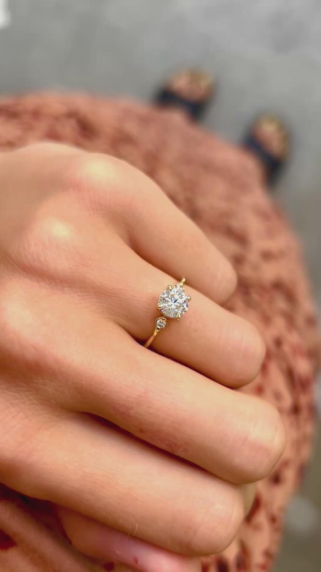 The round petite modern lab diamond Xevi Ring is elegant, petite, and timeless. Its slim design and refined details create a graceful look that feels subtle yet sophisticated. At the centre, a sparkling round brilliant diamond sits securely in fine claw prongs. Two lab grown diamond accents complete the design, adding balance and light.