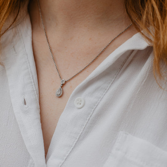 Our Rai teardrop pendant has a look of timeless elegance. The delicate cluster of scintillating melée captures the light, sparkling as you move. Dainty and comfortable to wear, Rai will carry you from day to night with ease.
