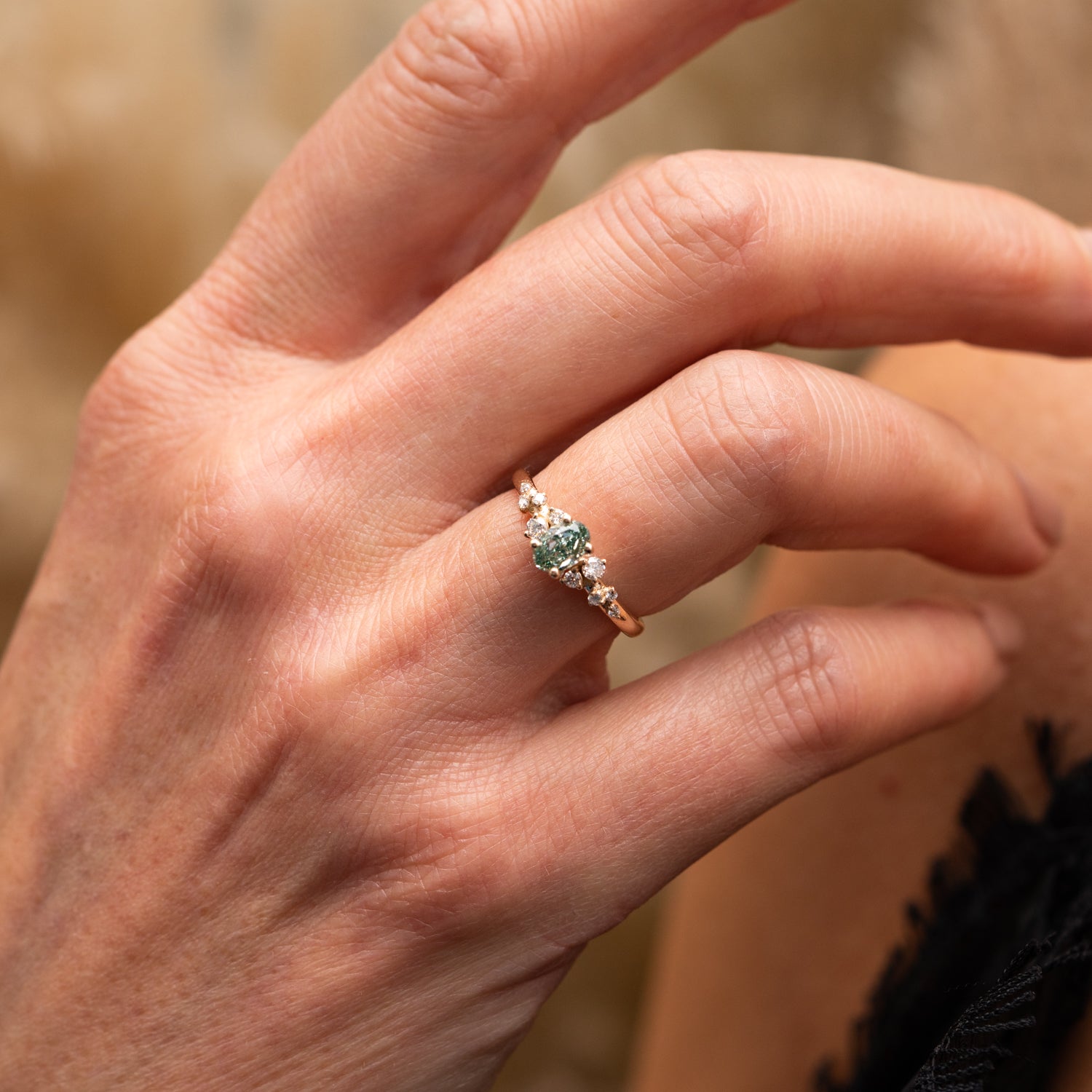 The 0.75ct green oval lab diamond Serephina Ring glows with vivid tones and timeless beauty. Its modern oval cut centre stone rests in 18k yellow gold, framed by delicate round brilliant accents that catch the light with every movement.
