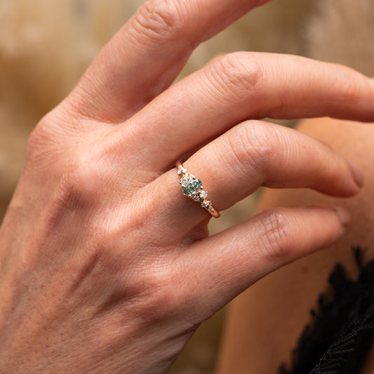 Whimsical and elegant, this design blends playful sparkle with refined style. Because of its slim band, the ring feels light and graceful, creating a flattering look on the hand. The scattered melée adds brilliance while letting the green center stone remain the star of the piece.