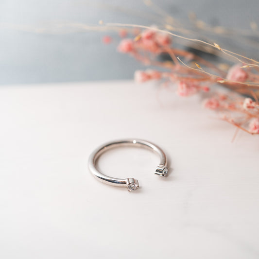 Crafted with a sleek and open shank, the Alina ring boasts a modern and chic look that is bound to turn heads. The negative space in the design creates a unique frame for your engagement ring to become the centerpiece of this unique band.
