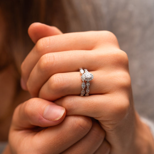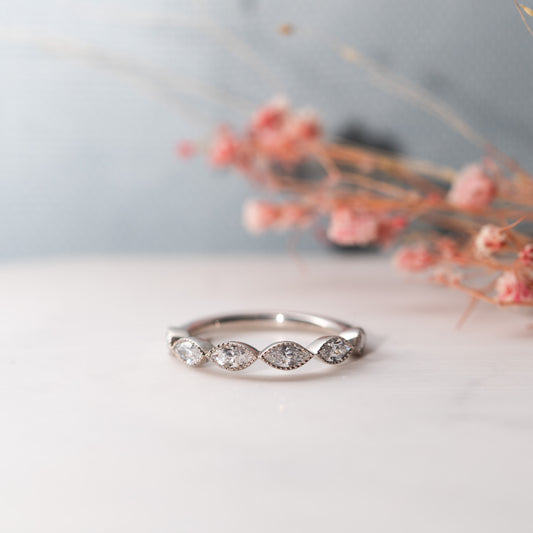 Carefully crafted with lab grown diamonds, this stacking ring is not only ethically and sustainably made, but also exudes timeless beauty. The Anwen Ring features a series of marquise cut lab grown diamonds, expertly set in a delicate vintage inspired milgrain band. The unique shape of these diamonds creates a subtle yet striking appearance.