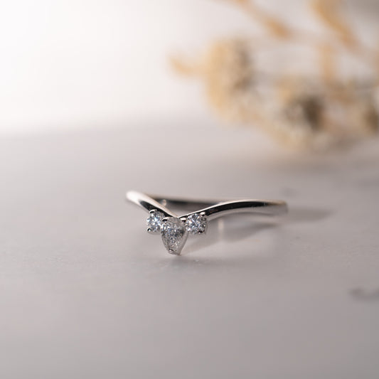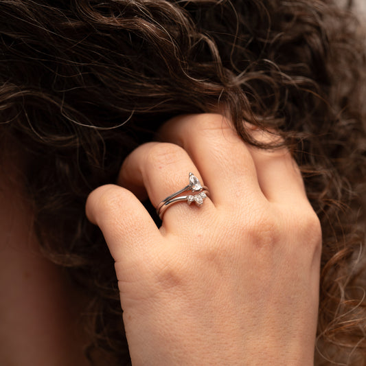 Danity and whimsical, The Dylan Ring is the perfect addition to any ring stack. The shape of the elegant contour band is emphasised by the pear cut lab grown diamond at its centre. Two petite round brilliant cut lab grown diamonds precisely frame the pear cut, creating a vintage inspired crown.