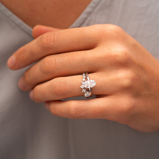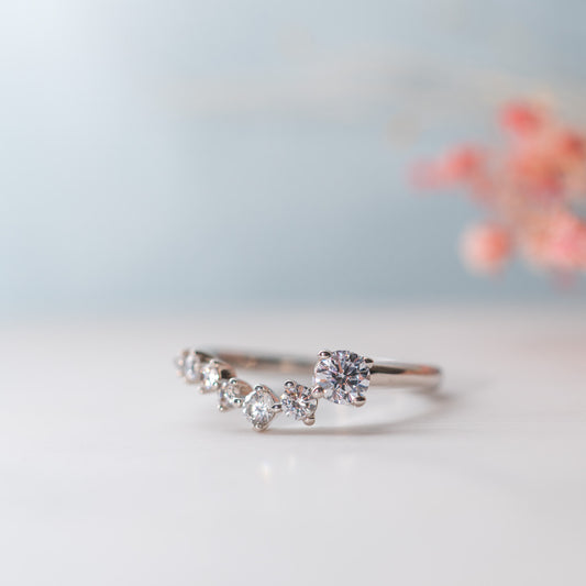 Crafted with meticulous attention to detail, the Inara ring features a unique curved band set with sparkling round brilliant cut lab grown diamonds. The diamonds gracefully follow the contours of the band, forming a mesmerizing wave of shimmer and sparkle.