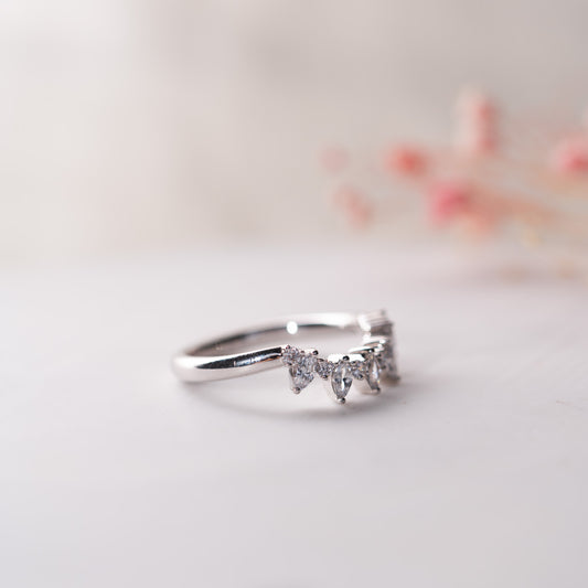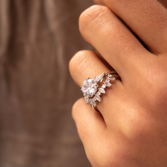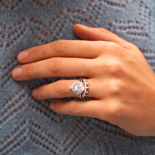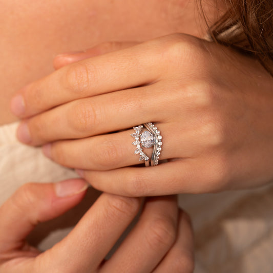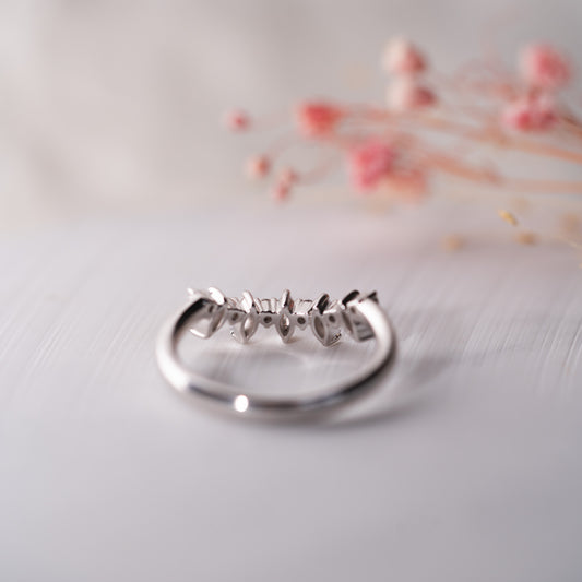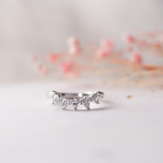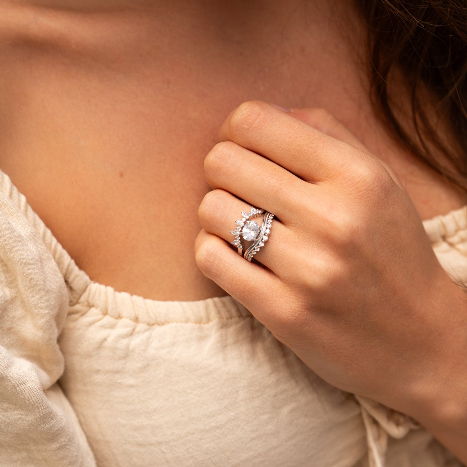 Add a touch of elegance and sparkle to your beloved engagement ring with our stunning Kira Ring. Carefully crafted to perfectly stack with your existing rings, this beautifully shaped tiara band is designed to elevate your engagement ring to new heights. The delicate curve of the Kira band is adorned with alternating round brilliant and marquise cut lab grown diamonds, creating a mesmerizing semi halo effect. Each diamond is expertly placed to catch the light and add a subtle shimmer to your finger.