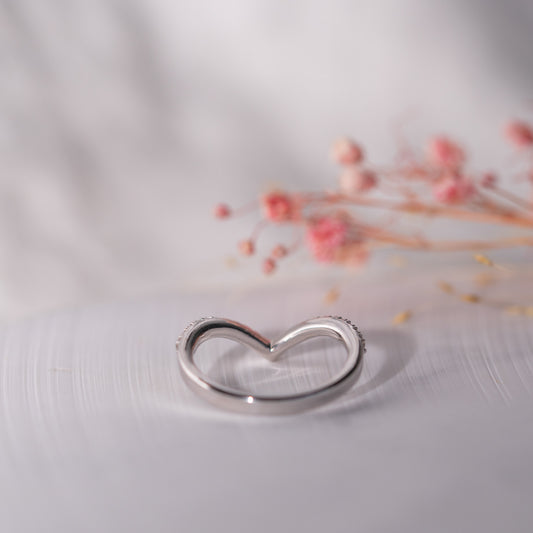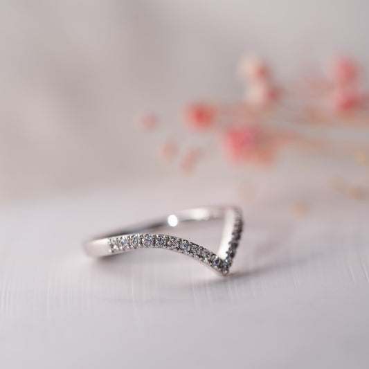 The unique design of the Lucie Ring features a structured shape that allows for seamless stacking alongside your beloved engagement ring. This exquisite piece is meticulously crafted and showcases a shimmering pavé set chevron band, elegantly encrusted with lab grown diamonds.