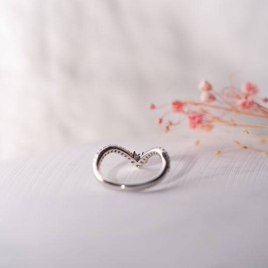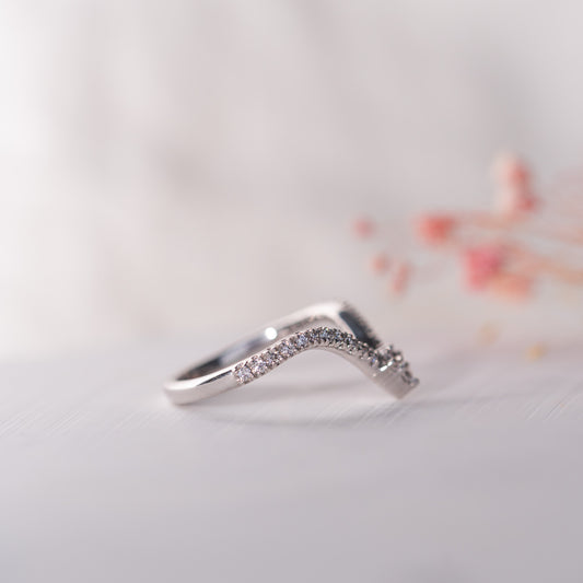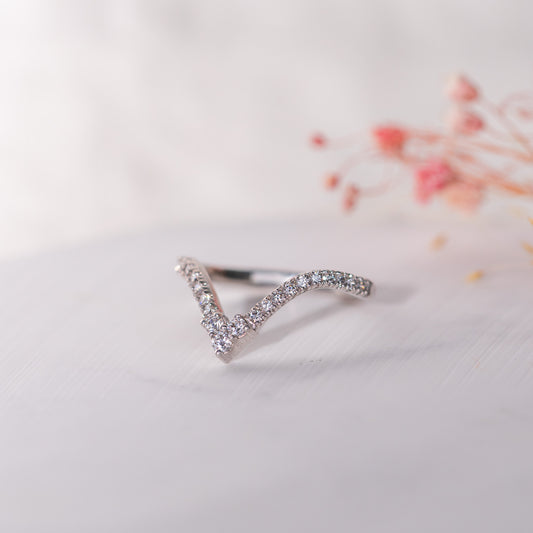 The perfect combination of modern and striking, the Lux Ring exudes a luxurious and timeless appeal. With its sophisticated chevron design, this ring is not only eye-catching but also versatile, making it the ultimate wedding band. This dainty pavé set band sparkles and shines with every movement. Wear it alone for a subtle touch of glamour or stack it with other rings for a bolder statement.
