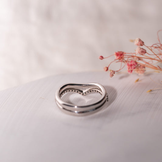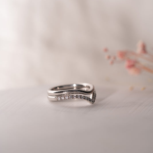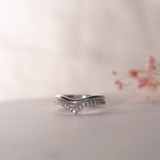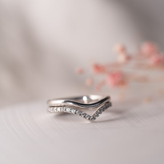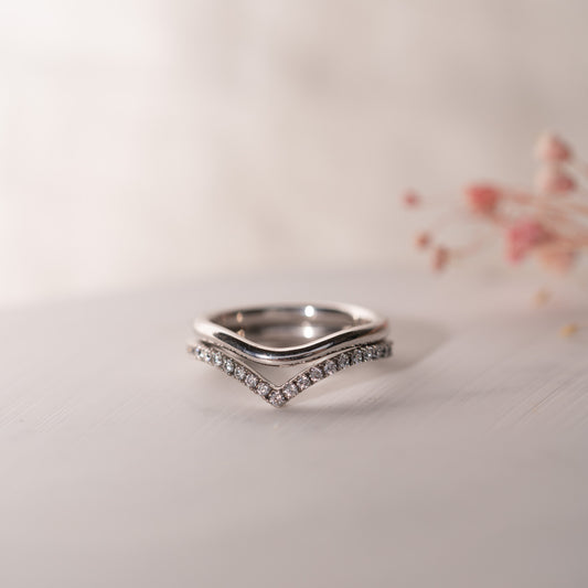 The exquisite Nira Ring is a modern double stacking band, adorned with mesmerizing lab grown diamonds. The chevron shape of the bands not only adds a touch of contemporary flair, but also allows for a flawless stack with your engagement ring.