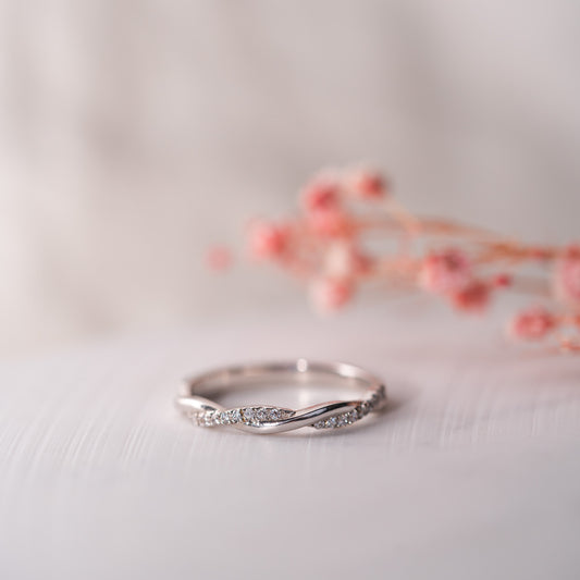 This exquisite Tala stacking ring features a unique twist design, reminiscent of the classic rope motif, delicately crafted to perfection. Adorned with breathtaking lab grown diamonds, this wedding band exudes a luxurious and ethereal aura, adding a touch of sparkle to every gesture.
