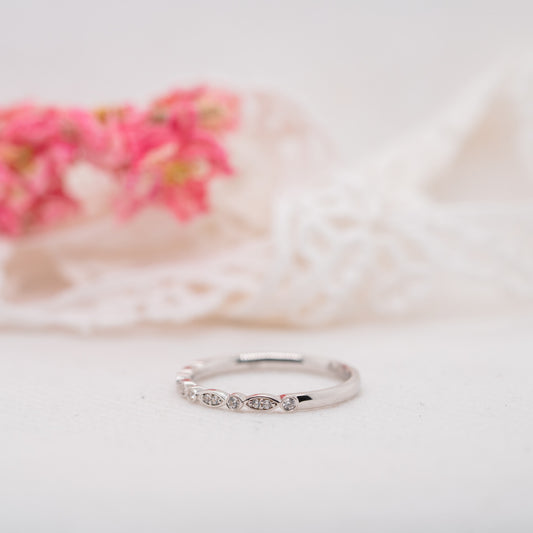 This vintage inspired ring catches the eye with dazzling lab diamond settings that grace the top half of the band in alternating round and delicate marquise shaped bezel settings which achieve a romantic, antique look. The Tilly Ring has delicate proportions and works great as a wedding band, stacking ring or completely on its own, making it perfect for everyday wear.