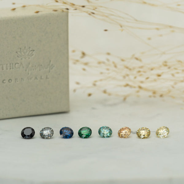 The Ethica Diamond collection has now extended into a range of beautiful coloured gemstones that are specifically grown individually to the intrinsic colour of them, meaning they are not post-treated and will never fade. They are also extremely durable, unlike their natural counterparts, which can be prone to cracking and chipping. How prone a gemstone is to external forces, such as breaking and chipping, is measured scientifically on a scale of hardness called the Mohs. Diamond being the hardest, which is measured at 10. Natural emeralds for example are 7.5, Topaz is 8 whereas Sapphire and Ruby is at 9 Mohs. Our moissanite coloured gemstones are almost as durable as diamond at 9.7 Mohs. The other good news is that each gemstone is independently graded by the GRI - Global Gemological Research Institute and comes with full certification of authenticity.