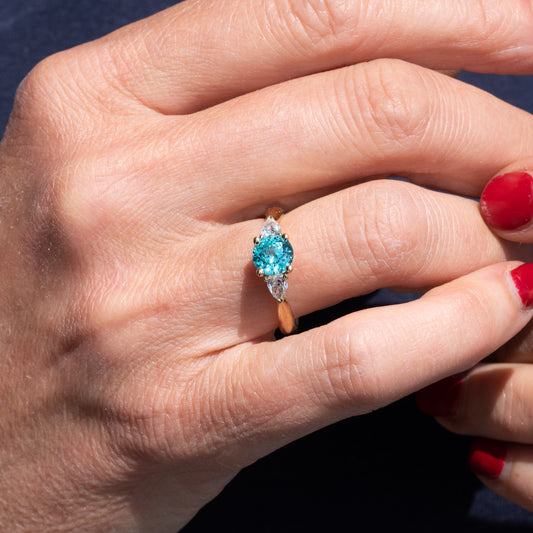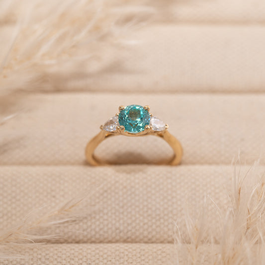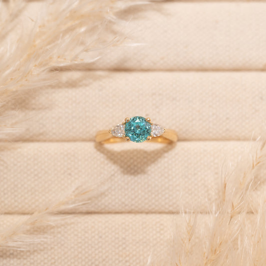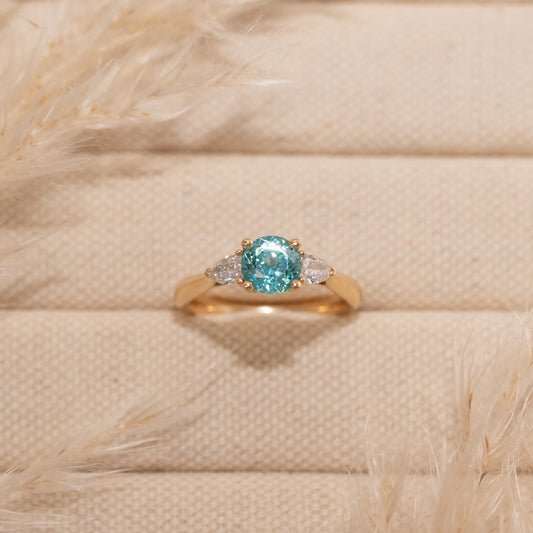 For a ring that sparkles with classic elegance, the Sophia trilogy ring is sure to take your breath away. Featuring a glittering Paraiba tourmaline centre stone with two E colour VVS pear cut diamonds.