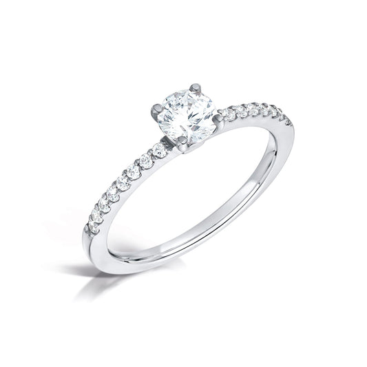 This ring is set with an expertly cut Ethica Diamond®, the finest grade D-E VVS1, independently certified moissanite and is set in Fairtrade 18k white gold.