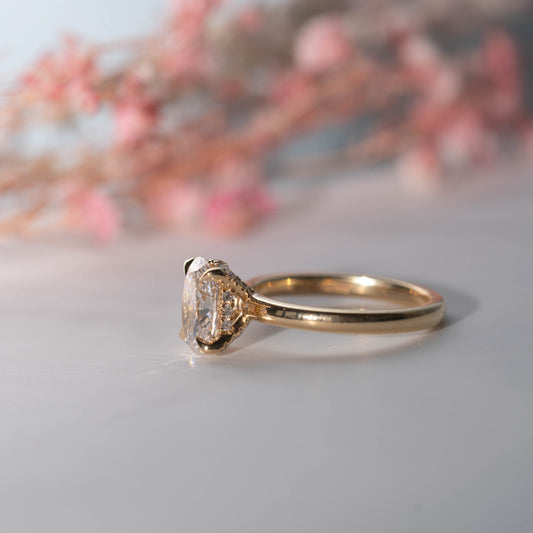 The 1.27ct hidden halo oval lab diamond Sira Ring shines with elegance and refined detail. Its oval cut center diamond rests in a classic four claw setting on a rounded band of fully recycled 18k yellow gold.