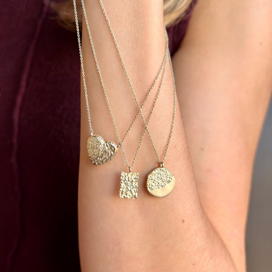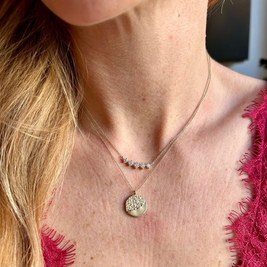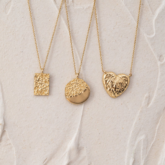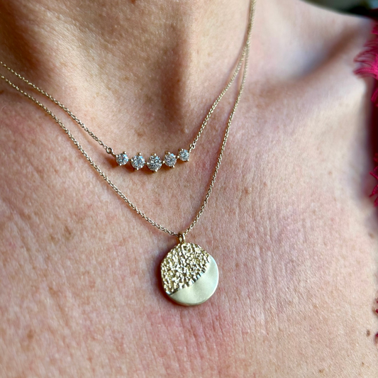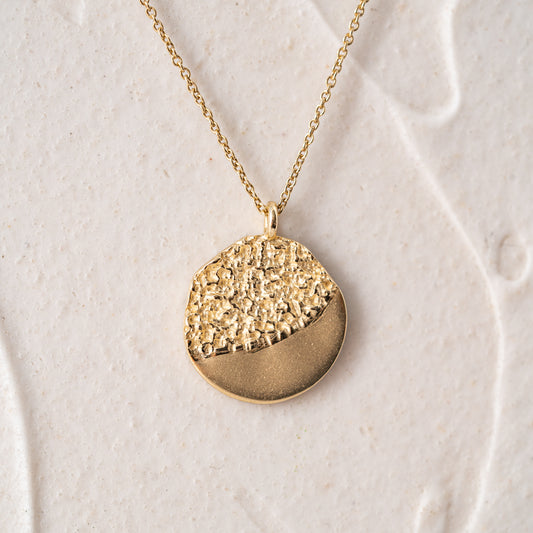 • Textured solid gold disc pendant on a delicate chain
