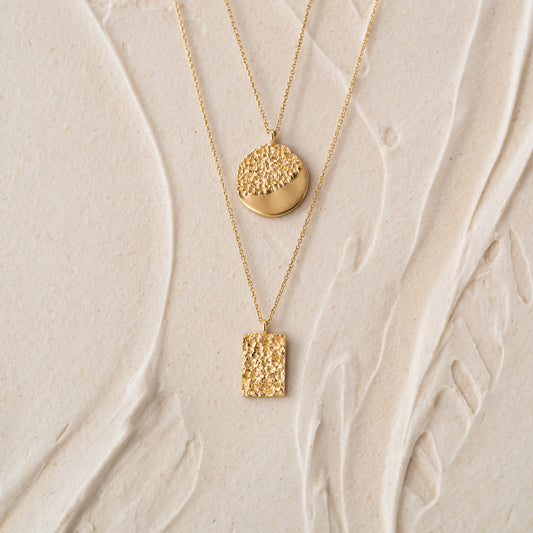 Made to be worn by anyone. The Phoenix Necklace is a modern, versatile piece that adds understated style to any outfit. The textured disc pendant hangs from a delicate 9k gold chain, making it perfect for layering with other necklaces or wearing on its own for a minimalist statement.