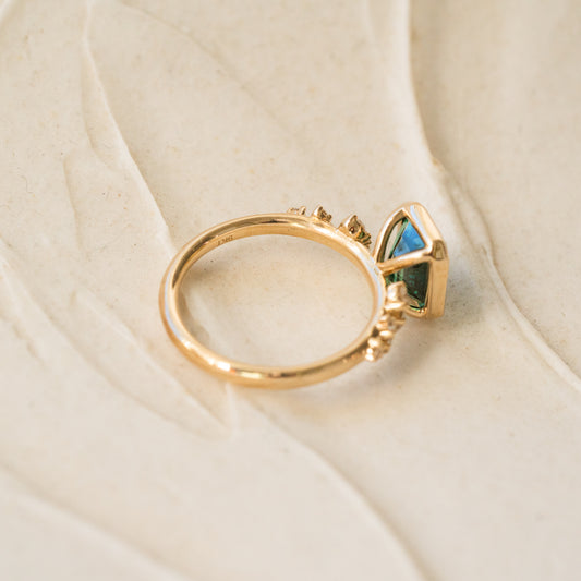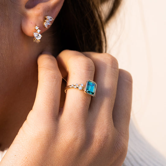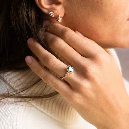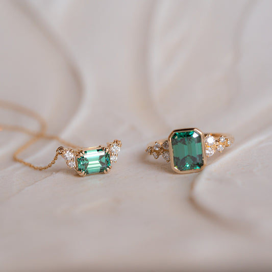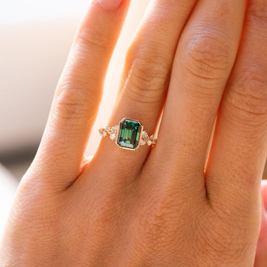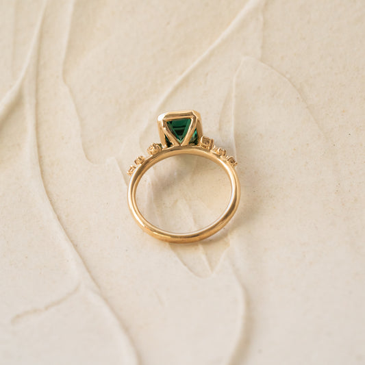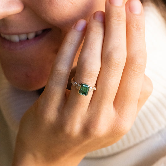 Elevate your style with The Zinnia, a captivating statement piece that blends timeless elegance with modern sophistication. This stunning ring features a vibrant green moissanite in an emerald cut, showcasing dazzling clarity and a rich, enchanting hue that catches the light from every angle.